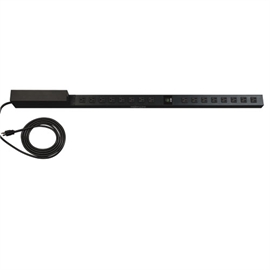 PDUMNV15 Monitored 49 in. / 124 cm 0U vertical rack PDU supports 15A peak capacity at 120V (agency de-rated to 12 amps continuous). Includes attached 5-15P input cordset and 16 5-15R outlets. Visual and remote current monitoring tracks real time output current level. Supports 0U vertical rackmount installation with included mounting brackets. Toolless button-mount installation supported in compatible racks. Included cord retention brackets keep vital network equipment plugged in and continuously powered.