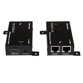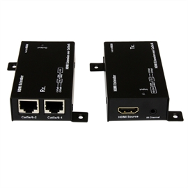 The ST121SHD30 HDMI over CAT5e/CAT6 Video Extender kit lets you extend HDMI audio/video and an IR remote control signal by up to 100 feet (30 Meters) over dual Cat5e or Cat6 cable. For added versatility this HDMI extender kit is powered via the HDMI bus, and does not require any additional power adapter.