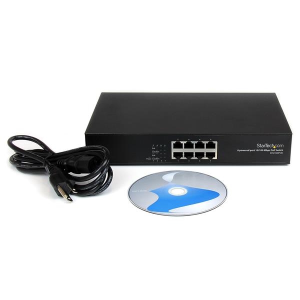 The IES8100POE 8-port 10/100 Mbps Power over Ethernet (PoE) Switch enables you to supply both power and data to up to 8 PoE-capable devices.