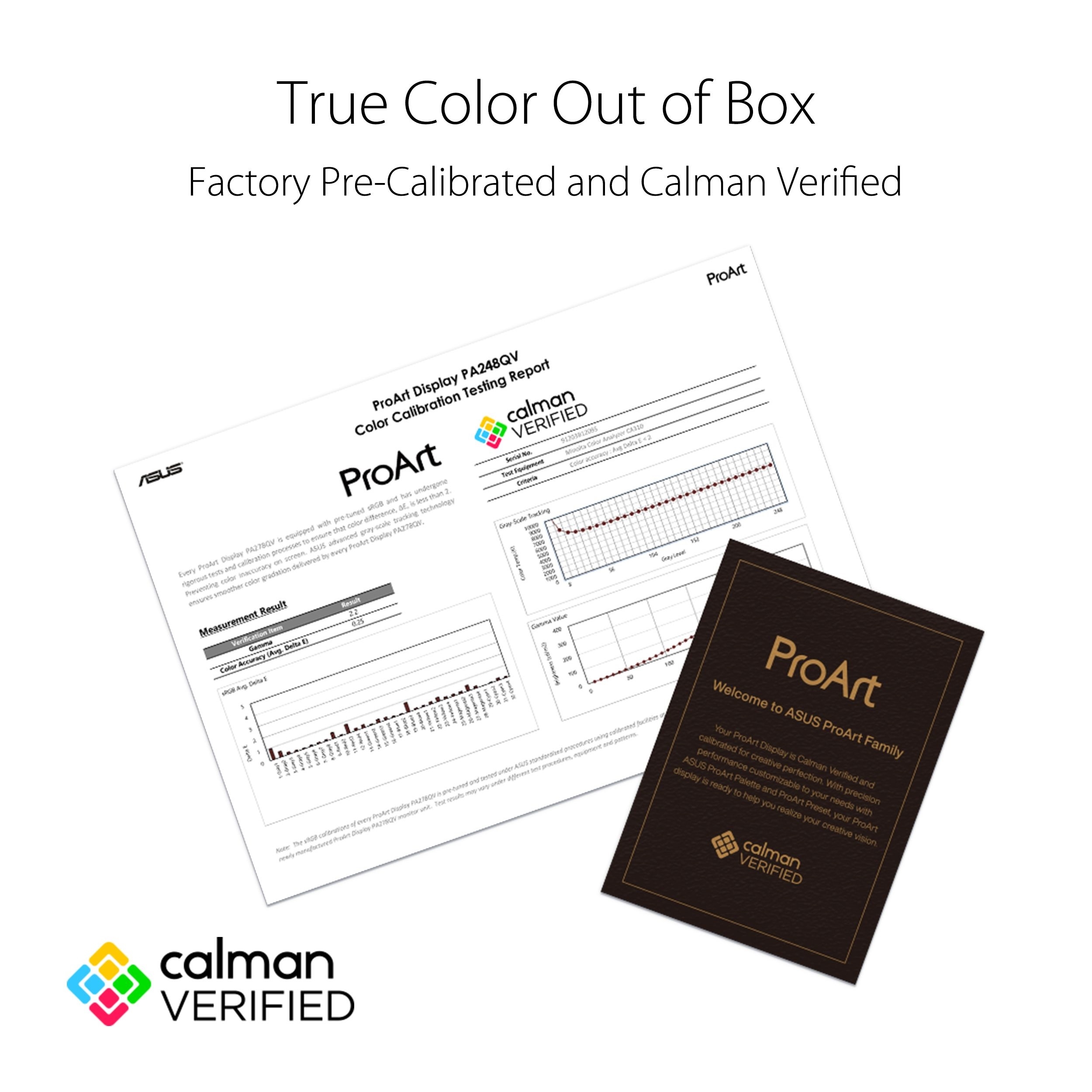 ProArt Display PA248QV is a 24.1-inch monitor designed to satisfy the needs of creative professionals, from photo and video editing to graphic design. ProArt Display PA248QV is factory calibrated and Calman Verified to deliver superb color accuracy (∆E < 2). It also provides industry-standard 100% sRGB / 100% Rec. 709 color space coverage. With ASUS-exclusive features, such as ProArt Preset and ProArt Palette with six-axis color, black-level and brightness adjustments, PA248QV makes it easy to achieve the exact look you desire quickly, easily and precisely.