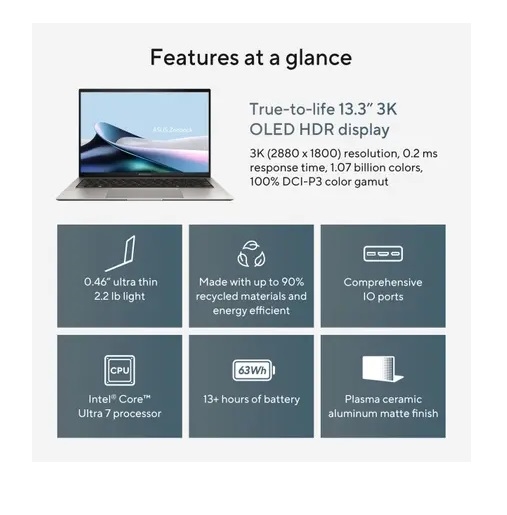 ASUS Lumina OLED display - Immerse yourself in unparalleled visuals with the Zenbook S 13's 16:10 displays boasting a 2880 x 1800 resolution, vibrant 400-nit HDR peak brightness, smooth 60Hz refresh rate, and Pantone® validated 100% DCI-P3 color accuracy.