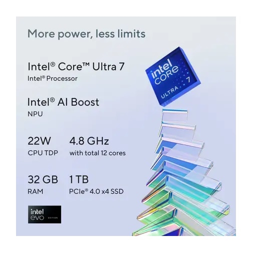 New AI-powered Intel® Core™ Ultra series - Intel® Core™ Ultra 7 Processor 155U 1.7 GHz (12MB Cache, up to 4.8 GHz, 12 cores, 14 Threads) and Intel® Graphics. With 1TB SSD storage and 32GB LPDDR5x RAM, explore with more speed, more seamlessly.