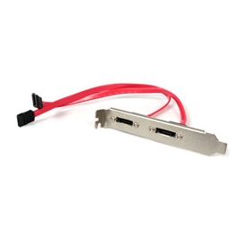 StarTech.coms eSATA SATA adapter plate adds external data support to any existing Serial ATA controller, adding two eSATA ports for connection to external SATA devices.The adapter plate can be mounted to the rear panel of the computer case, providing straightforward eSATA to SATA connections and allowing users to connect their eSATA device (hard drive enclosure, etc.) to the provided eSATA port which is an extension of the motherboard SATA data connector.Designed to take advantage of the increased data integrity provided by external hard drives or RAID devices that support eSATA connections, the eSATA SATA adapter supports data transfer rates of up to 300 MBps and is backed by StarTech.coms Lifetime Warranty.