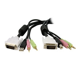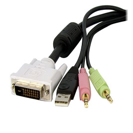 This 10ft four-in-one DVI/USB KVM cable integrates dual link DVI video quality with USB mouse and keyboard, 3.5mm audio out and microphone connections into a single, compact cable.
