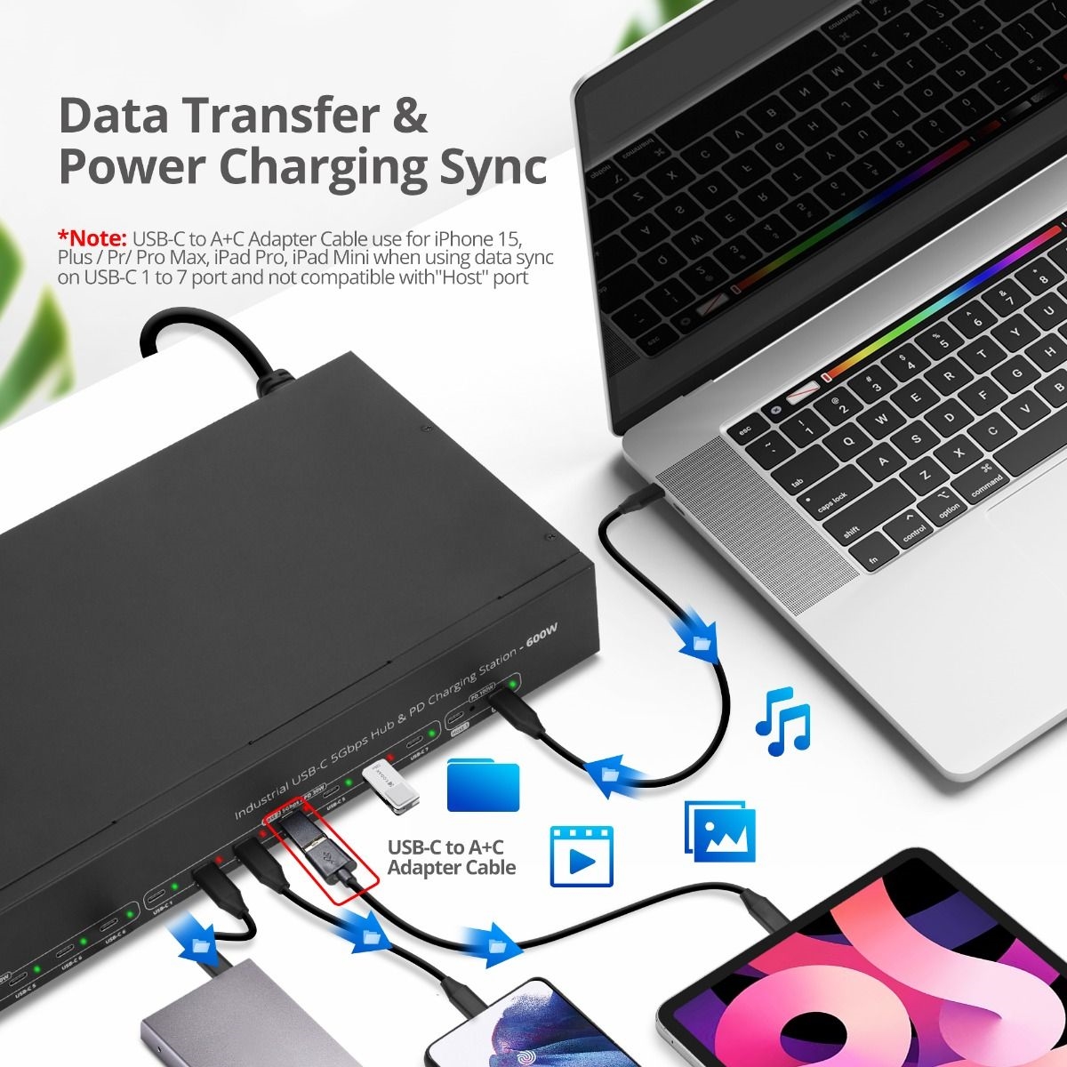 Please plug the USB-A to C adapter to ID-US0B11-S2 USB-C 1 to 7 port, and then plug the USB-C connector of the cable to iPhone 15 or iPad Pro / iPad Mini device. This can let the iPhone 15 or iPad Pro / iPad Mini device charging and do the data sync simultaneously, not just charging