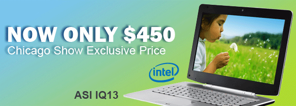 | Get the super slim ASI IQ13 notebook now for only $450 (After discount & Show only Price). How? Register and attend the upcoming ASI Tech Expo - Chicago, on June 10 and take advantage of this once in a bluemoon offer. It is that easy. While you enjoy learning new trends, making more profit while beating the competition you also get to have clean fun away from the office. Even better, this offer makes it all worthwhile to be at the ASI Tech Expo - Chicago. |
